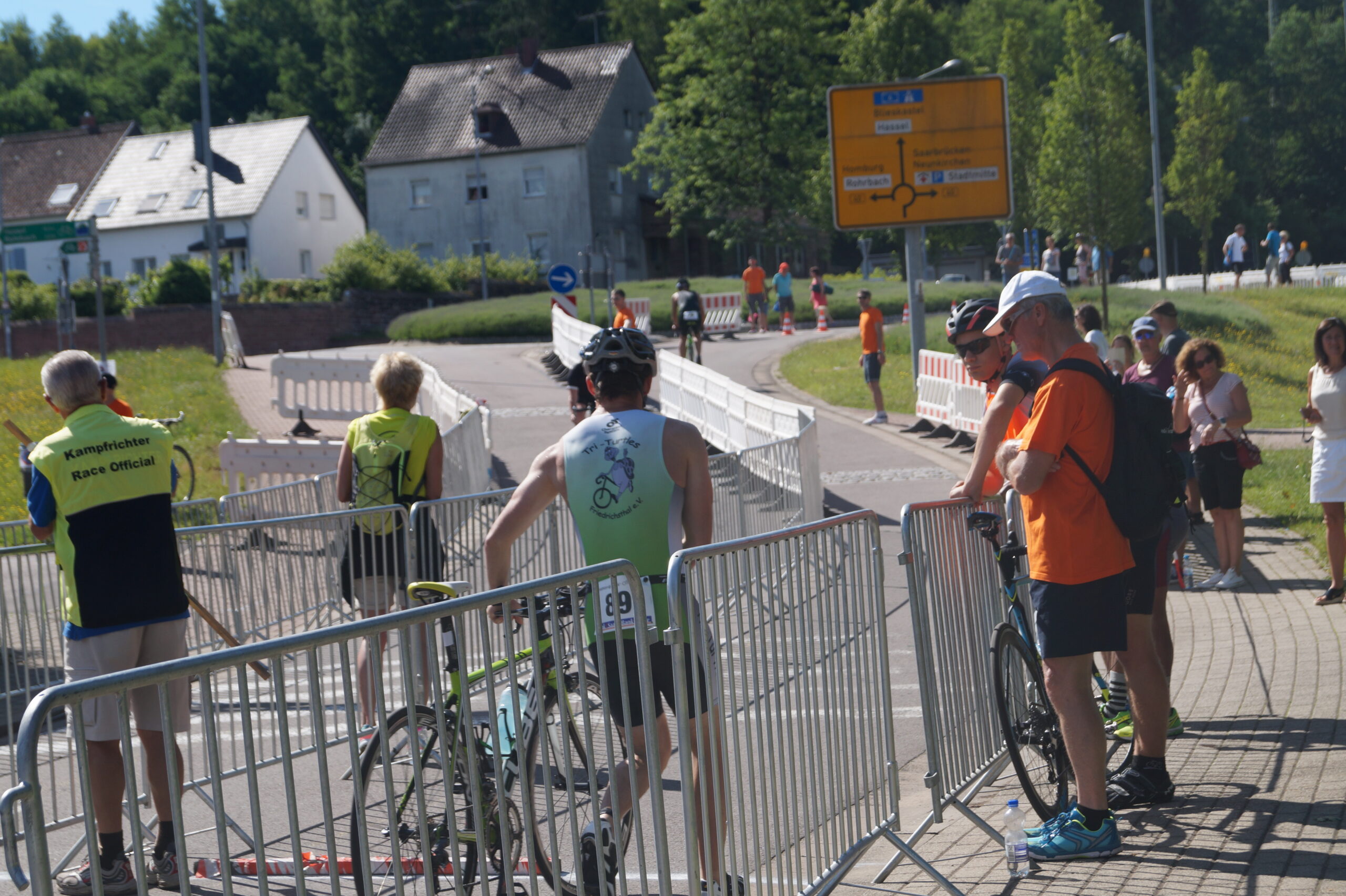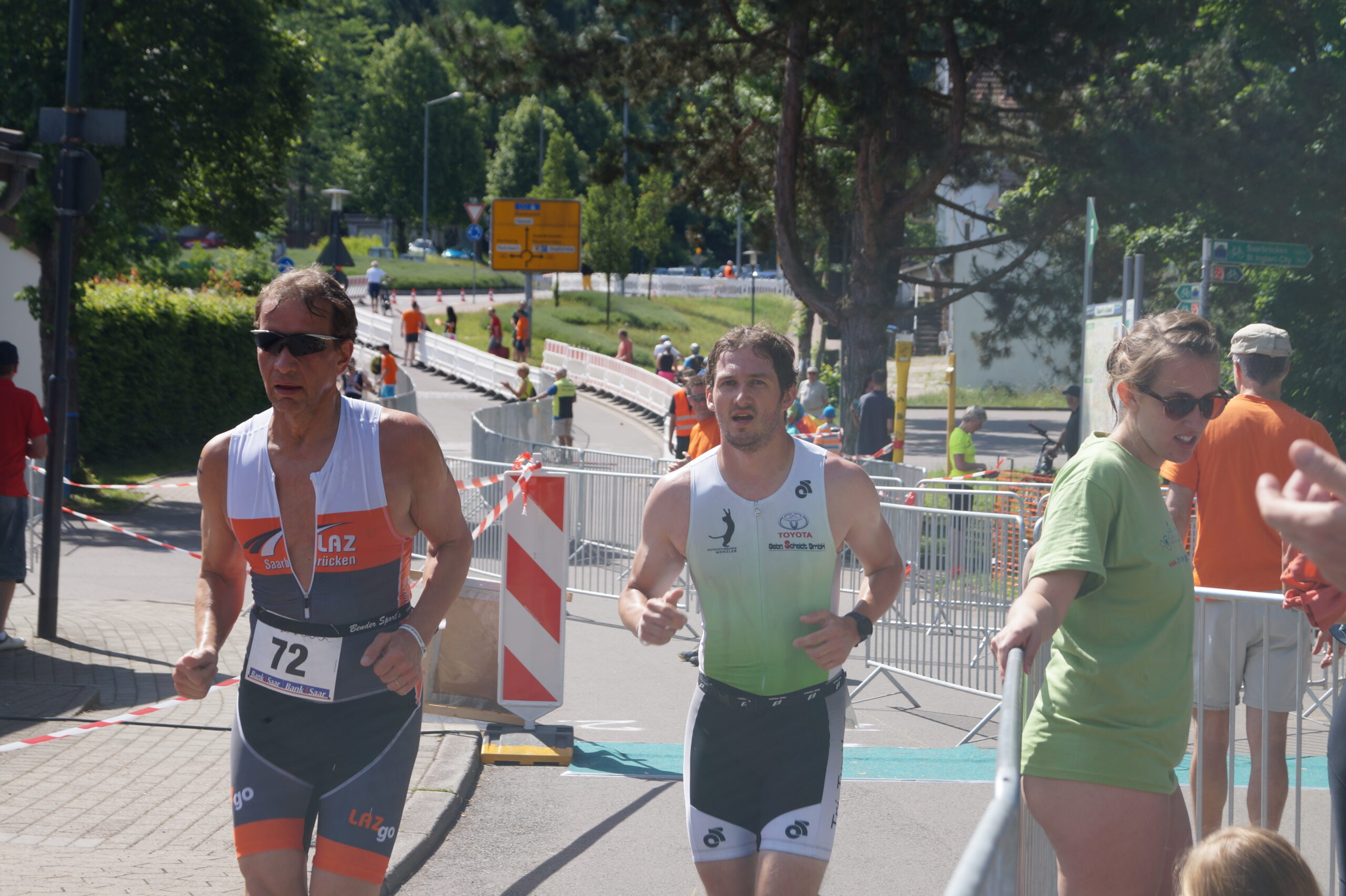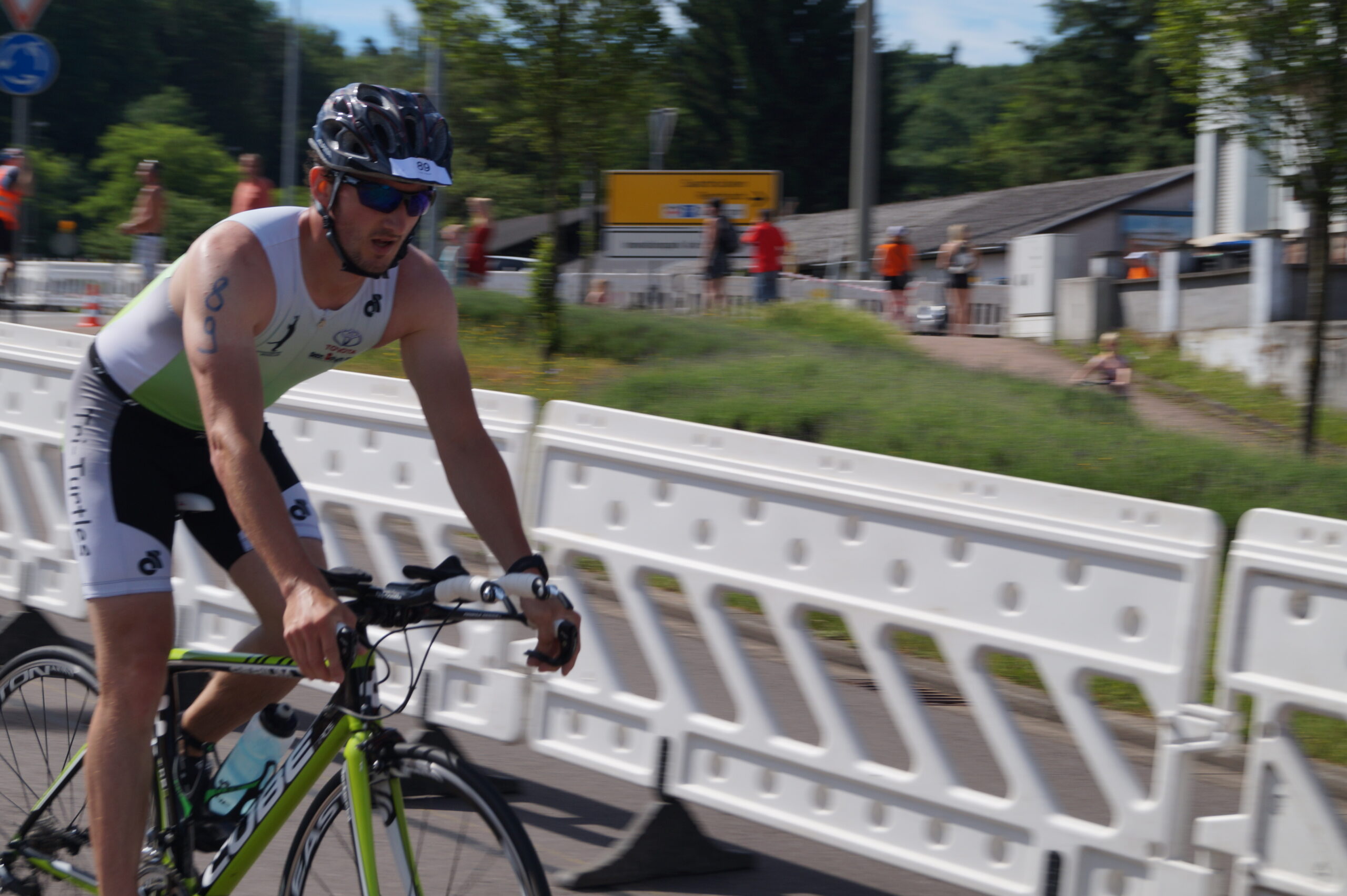 Nachdem ich mich endlich auf das Rad schwingen konnte, habe ich erst was getrunken. Ein von der Sonne aufgeheiztes ISO-Getränk ist allerdings nicht sehr erfrischend. Schwimmen ist einfach noch viel zu anstrengend, aber nach ein paar Metern war alles ok und es ging vorwärts. Die 10km Runde beginnt mit einem kleinen Anstieg, ist aber insgesamt relativ flach. Nach der Abfahrt konnte ich das Tempo hoch halten und bei dem zweiten Anstieg wäre vielleicht noch etwas mehr drin gewesen, aber man muss ja auch etwas Energie für den Lauf sparen. Mit etwa 36 Minuten und einem Schnitt von 31 km/h habe ich mich zum Vorjahr deutlich gesteigert.