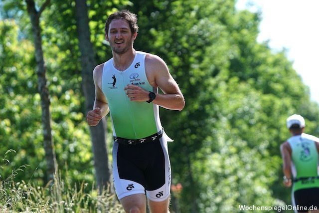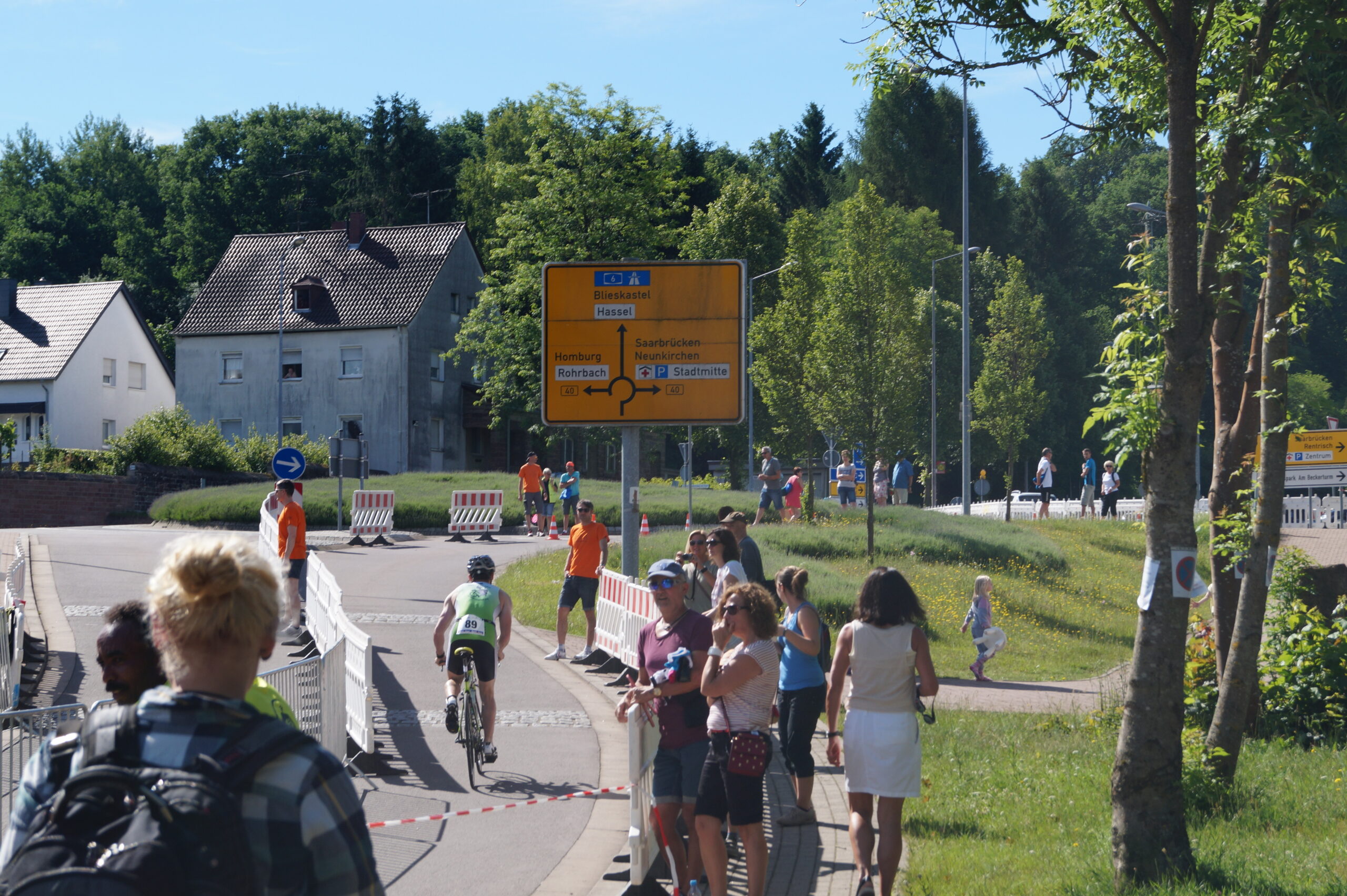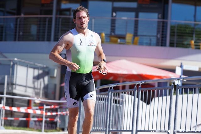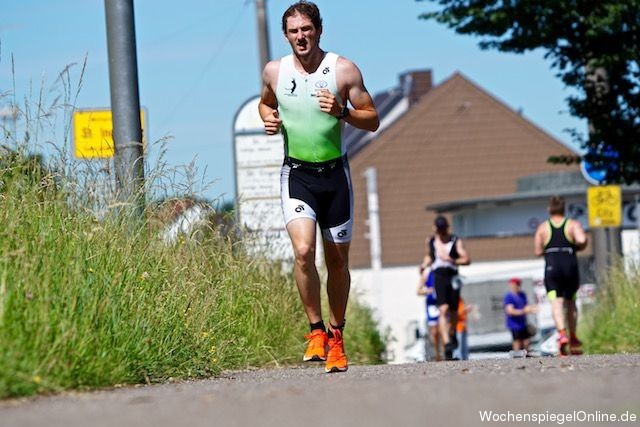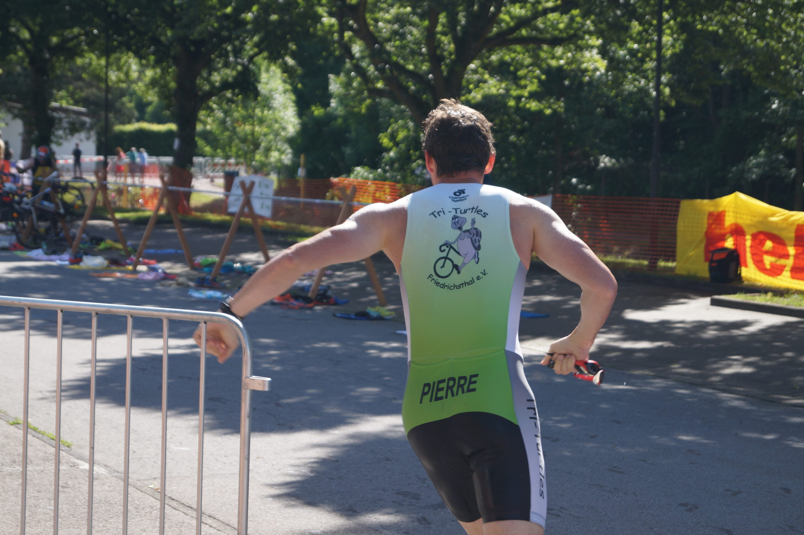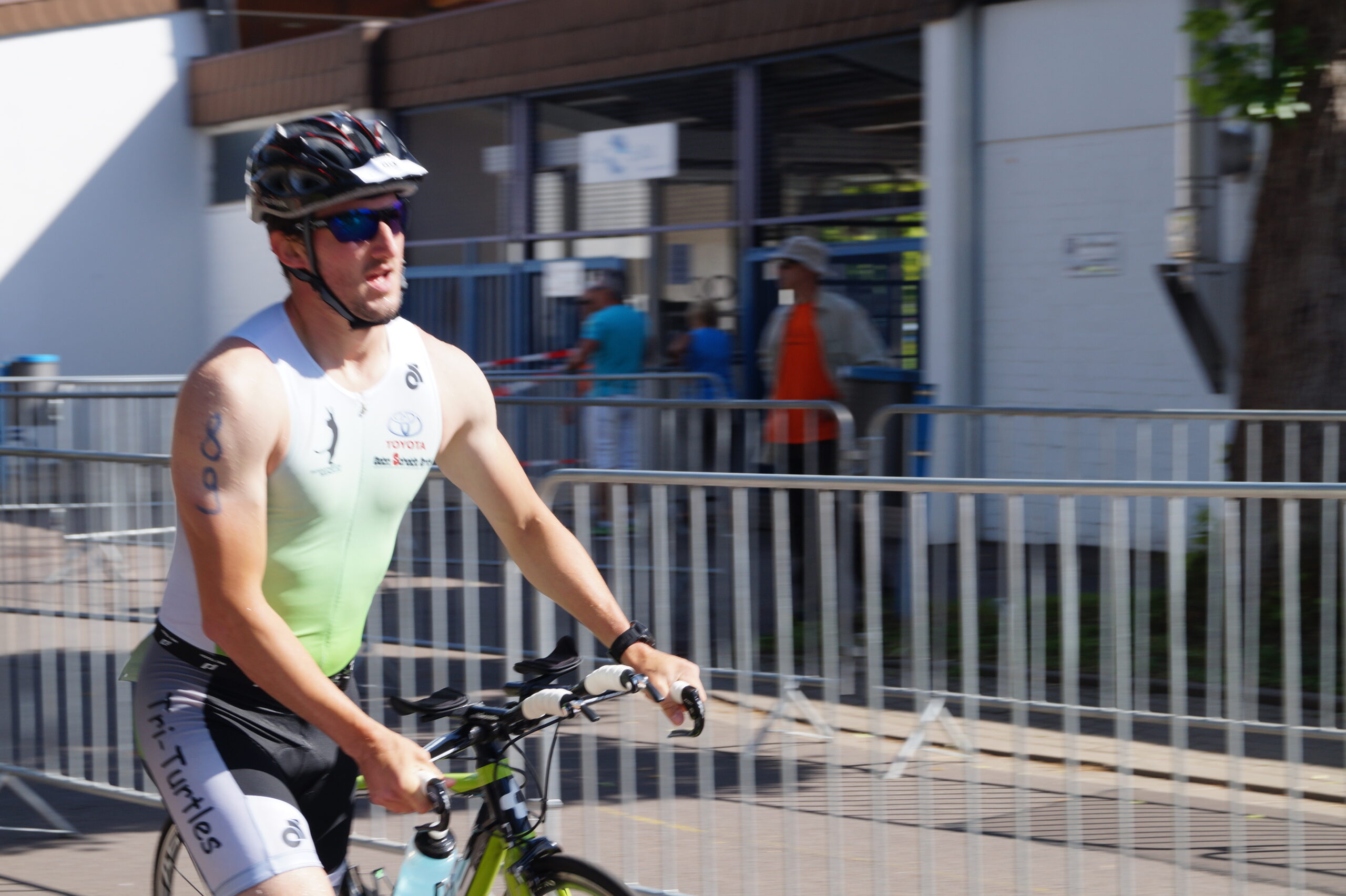 Nachdem ich mich endlich auf das Rad schwingen konnte, habe ich erst was getrunken. Ein von der Sonne aufgeheiztes ISO-Getränk ist allerdings nicht sehr erfrischend. Schwimmen ist einfach noch viel zu anstrengend, aber nach ein paar Metern war alles ok und es ging vorwärts. Die 10km Runde beginnt mit einem kleinen Anstieg, ist aber insgesamt relativ flach. Nach der Abfahrt konnte ich das Tempo hoch halten und bei dem zweiten Anstieg wäre vielleicht noch etwas mehr drin gewesen, aber man muss ja auch etwas Energie für den Lauf sparen. Mit etwa 36 Minuten und einem Schnitt von 31 km/h habe ich mich zum Vorjahr deutlich gesteigert.
