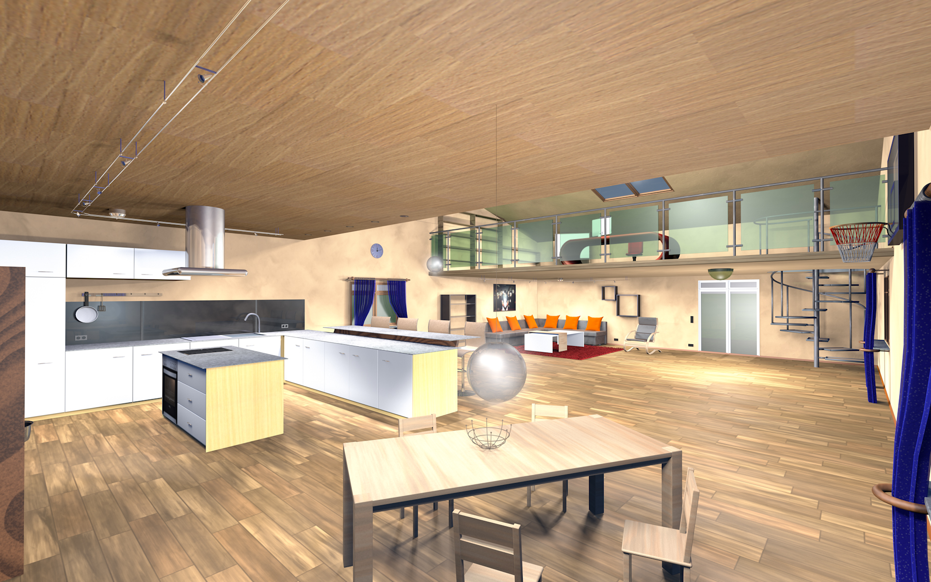 Für mein Projekt setzte ich mir als Ziel, eine kleine Wohnung zu modellieren. Ich plante eine Küche, Wohnbereich, Essbereich und ein Büro zu erstellen. Die Umsetzung kann man sich hier durchlesen  (Dokumentation). Hier die Ergebnisse: Gesamtansicht: gesamt Die Küche:Küche Der Wohnbereich:Wohnzimmer Das Büro: Büro,